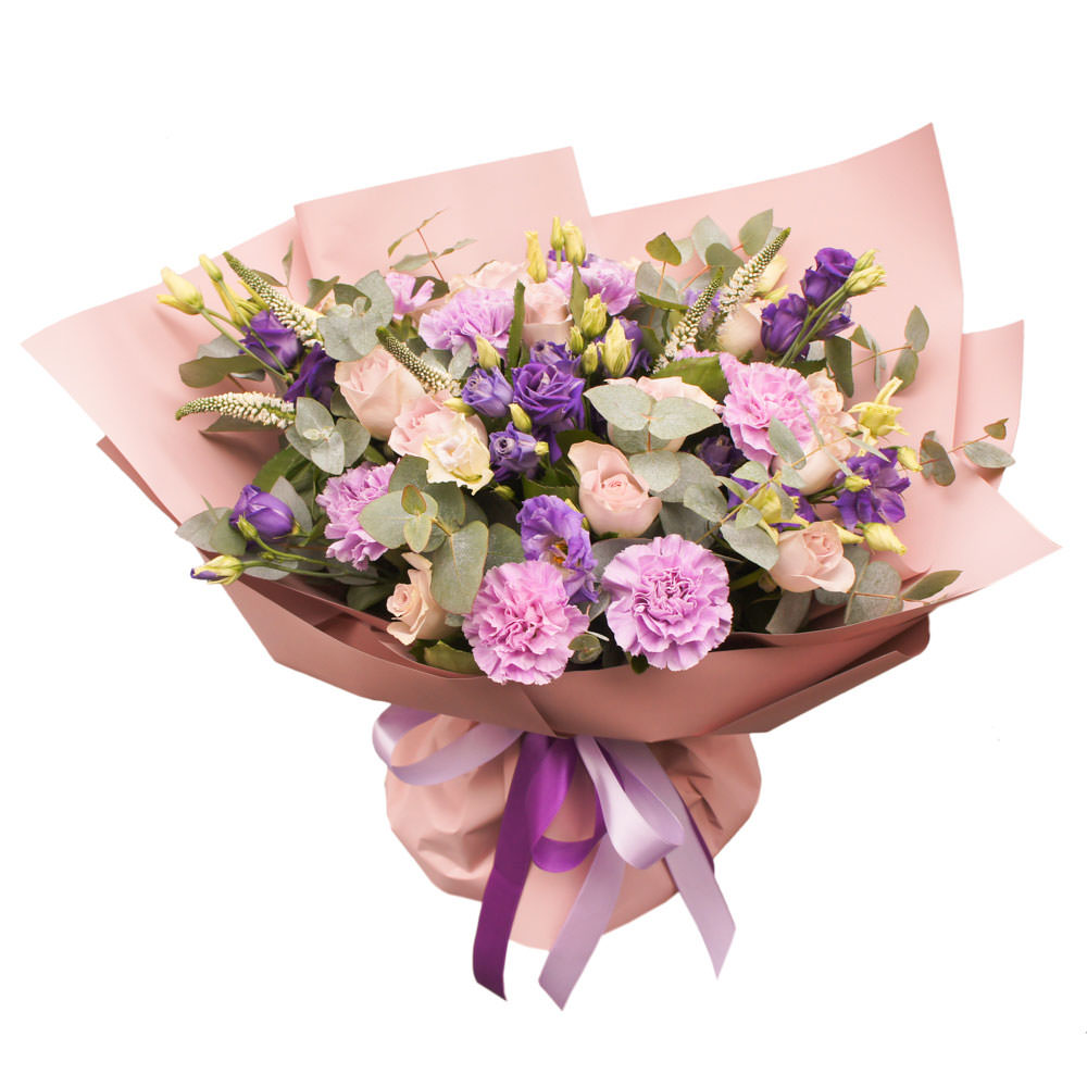 На фото представлен образец. Объем букета зависит от выбранного вами размера. Точное количество цветов и цветовую гамму вы можете уточнить у менеджера по телефону.